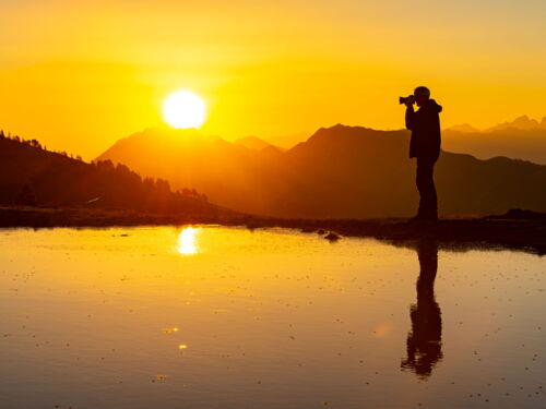 Nach einem frühen Abendessen um 17 Uhr starteten wir mit unseren Kameraausrüstungen zur Motivjagd. Beim See(li) angelangt mussten wir feststellen, dass es den Tieren wohl zu heiss war, um vor unseren Kameras herumzuturnen. Da es noch früh genug war, entschieden wir uns weiter zu wandern. Oben am Burgfeldstand entdeckten wir weit entfernt eine Steingeiss und ein Murmeltier. Sonst waren leider keine Tiere in Sichtweite. Inzwischen näherte sich der Sonnenuntergang. Wir machten uns auf den Rückweg, um eine geeignete Stelle zum Fotografieren zu suchen.