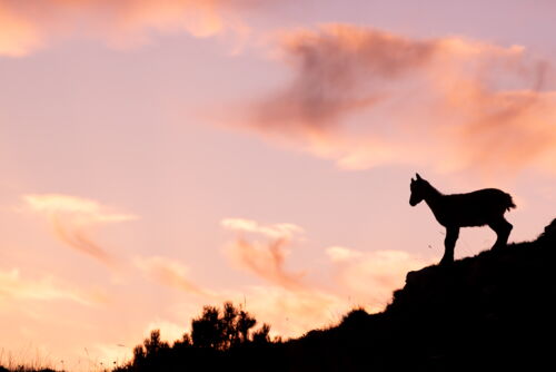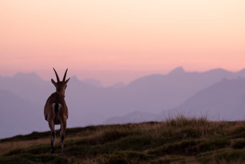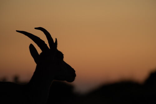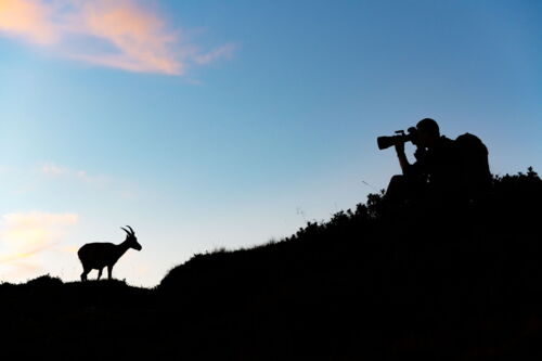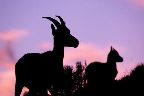 Ganz unerwartet „stolperten“ wir über eine Steingeiss und da waren plötzlich auch noch zwei Kitze, ca. 2 Monate jung. Sofort richteten wir unsere Kameras auf die Tiere anstatt gegen den Himmel. Roland und Lamya vergassen zum Glück nicht ganz, dass wir eigentlich auch den Sonnenuntergang fotografieren wollten. Es tauchten immer mehr Steingeissen direkt vor uns auf. Als es uns das Licht bereits schwer machte die Tiere gut belichtet aufzunehmen, begannen wir mit Silhouetten Bildern. Steinwild vor einem rot leuchtendem Himmel, das war atemberaubend. Ab diesem Moment war ich nicht mehr die einzige mit einer ausgeprägten Steinbock Begeisterung. Christine hatte es ebenfalls erwischt und sie schwärmte jubelte und frohlockte nun genauso intensiv wie ich. Man sass fotografierend in der Natur, umgeben von Wildtieren, vergass die Welt rundherum und fühlte sich einfach überglücklich.
