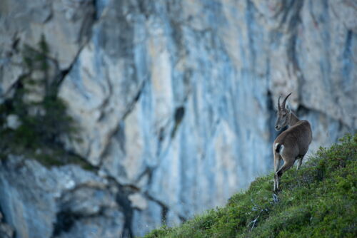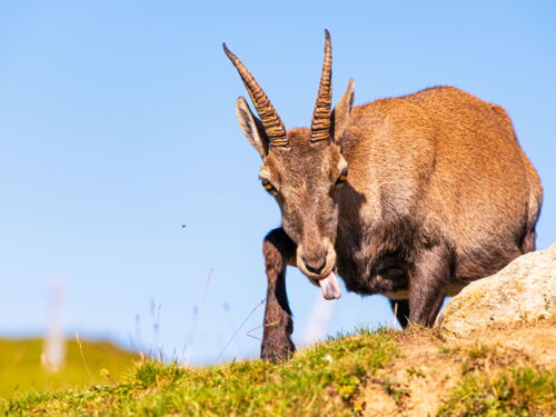 Als wir auf dem Rückweg zum Berghaus Niederhorn waren, hielten wir weiter Ausschau nach Steinwild. Einige waren immer noch im Nordhang wie heute morgen. Plötzlich sagte Peter: „Da, da sind sie“ und zeigte auf den Wanderweg. Tatsächlich, da standen 4 Steingeissen mitten auf dem Weg. Sie leckten an zwei Steinen und liessen sich von uns nicht wirklich stören. Es dauerte nicht lange und unsere Kameraauslöser liefen wieder auf Hochtouren.