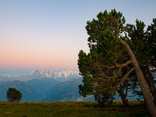 Die Sonne liess, wegen der Berge, auf sich warten. Als sie dann hinter der Bergkulisse auftauchte, ging alles ruckzuck. Die Kameras klickten im Serienbildmodus und kaum 2 Minuten später war der Sonnenaufgang fotografisch gesehen, vorbei. Noch einmal ein Blick auf die in der Sonne strahlenden Berggipfeln des Eiger Mönch und Jungfrau Massivs und dann ging es weiter entlang des Güggisgrats, um hoffentlich dort anwesendes Steinwild zu entdecken. Einige Tiere, hielten sich im schattigen Nordhang auf. Nach einiger Zeit der Beobachtung und einigen Bildern mit grossen Brennweiten, ging es weiter bis auf den Burgfeldstand. Das Panorama war wie immer herrlich und wir genossen die Aussicht.